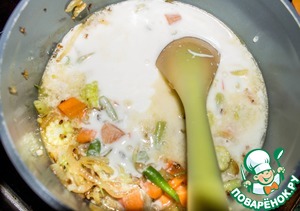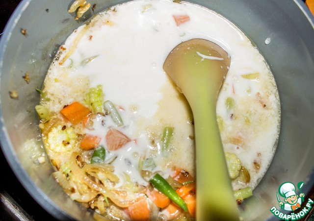 К тушеным овощам выкладываем рис с кокосовой стружкой, молотый черный перец, пажитник. Вливаем йогурт и воду. Тщательно размешиваем и ставим на самый маленький огонь. Томим 25 минут, периодически помешивая.