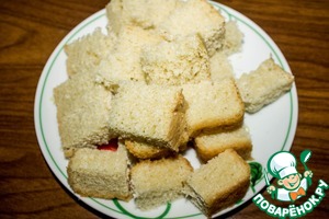 Пока томится бирияни, отрезаем три куска хлеба и нарезаем их средними кусочками.