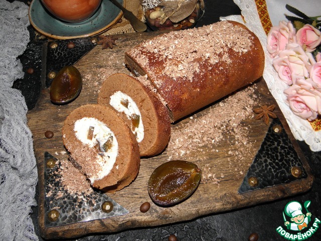 Нежнейший бисквитный рулет. С насыщенным шоколадным вкусом и ароматом слив. Творожный крем как нельзя лучше дополняет картину осеннего натюрморта. С наилучшими пожеланиями рулет отправляется имениннице Маше (Masha Vet). Угощайтесь!