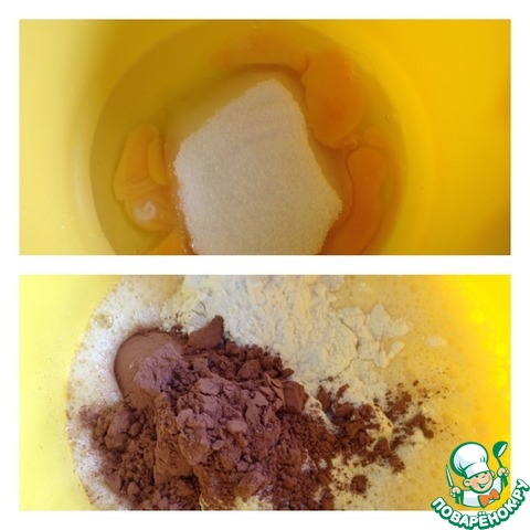 Яйца взбить с сахаром буквально секунд 15. Затем всыпать какао, муку и сухое молоко с разрыхлителем. Взбить тесто секунд 10.