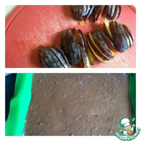 Духовку разогреть до 200 гр. Противень застелить силиконовым ковриком и выложить тесто, разровняв его ложкой. Выпекать бисквит минут 5-7. Тем временем вымыть и вы сушить сливы, удалить косточки. Нарезать сливу тонкими слайсами.