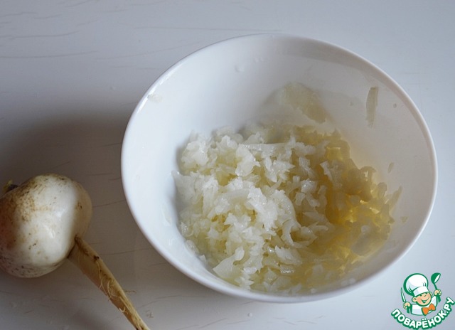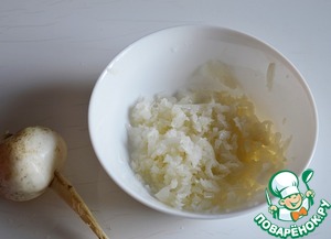 Редьку очистить, натереть на крупной терке, отжать от излишков сока.