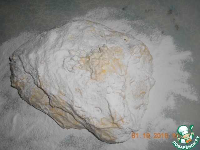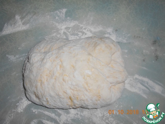 Выкладываем тесто на стол присыпанный мукой, сверху тоже присыпать мукой, чтобы не прилипало к рукам. Немного разровнять его руками в прямоугольник.