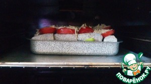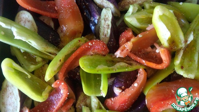 Выложить овощи на противень с высокими стенками, сбрызнуть маслом, приправами, я брала смесь перцев, все перемешать