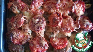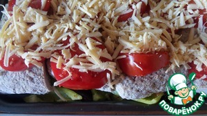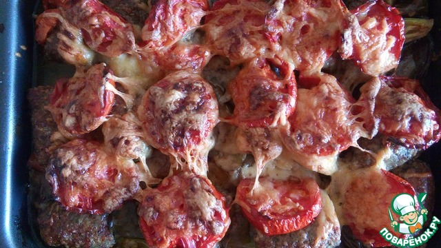 На овощи выложить котлеты, на котлеты положить по кусочку помидора, посыпать все тертым сыром