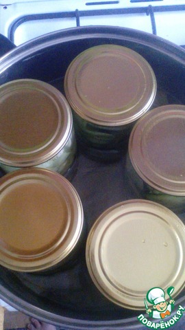 Заложить в стерилизованные банки (0,5-0,7л.) и стерилизовать 30-40 минут. Банки закрутить. Укрывать или нет на Ваше усмотрение. Я ни когда банки не укутываю, вкус не меняется. Приятного аппетита.