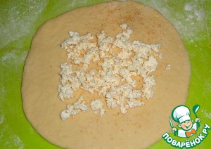 Тесто делим на равные части, получается примерно 5-6 штук. Раскатываем в лепешку. По центру раскладываем творог и посыпаем приправой. Можно добавить зелень.