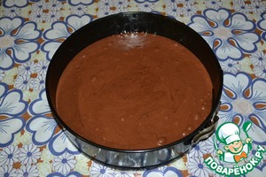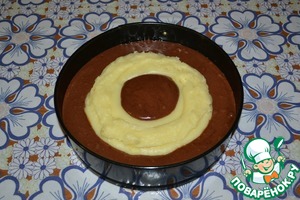 Аккуратно выложить на тесто крем по кругу кольцом. Это можно сделать ложкой или выдавить крем из кулинарного пакета, как это сделала я. Поставить форму в разогретую духовку и выпекать при температуре 180 градусов 50-60 минут. Время выпечки зависит от духовки. В любом случае, готовность шоколадной основы проверяйте зубочисткой в серединке.