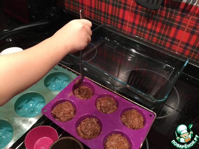 Распределите по 1-2 ч. л. теста в каждую формочку. На серединку положите по 1 ч. л. шоколадной пасты.
