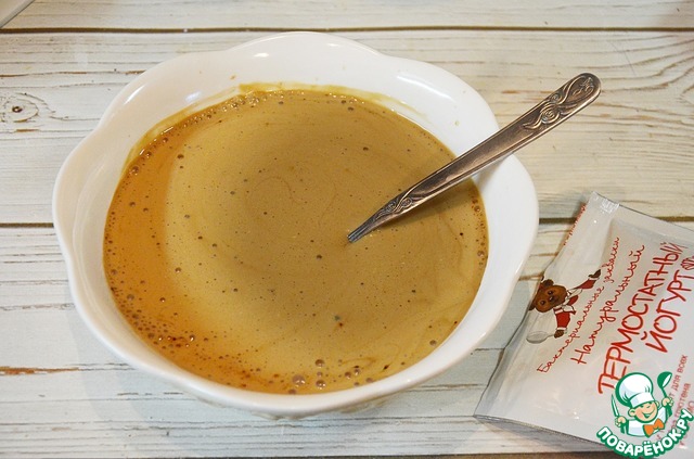 Для приготовления блинов нам понадобится йогурт. Приготовим йогурт сами с помощью термоса и закваски от Oursson. В чаше термоса смешайте пакетик закваски для приготовления йогурта с молоком комнатной температуры.