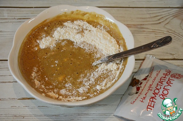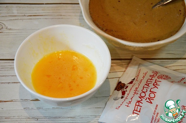 Яйцо взбейте с сахаром и маслом, добавьте к йогурту.