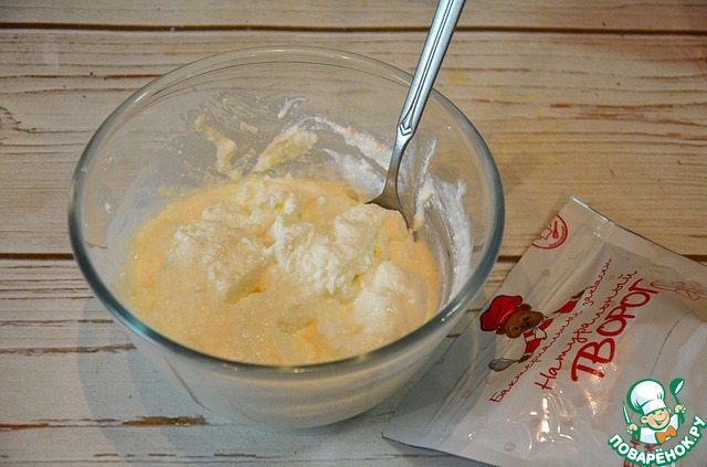 Добавьте к нему сливки и сахарную пудру.