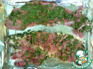 Мясо нарезать пластами, отбить и засыпать свежей зеленью, оставить мариноваться минут на 25.