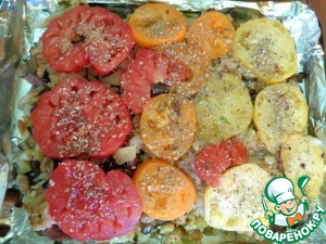 Нарезать помидоры кружочками и положить сверху, посыпать их приправой.
