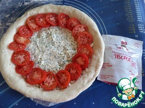 Тесто раскатываем в виде лепешки. Выкладываем в форму смазанную маслом, формируем бортики. Выкладываем на тесто творожную начинку. Равномерно распределяем.