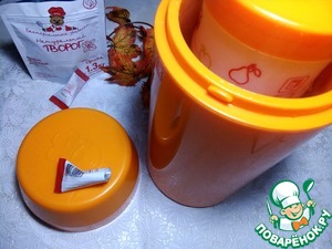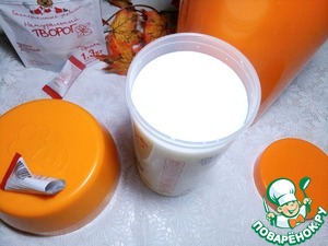 В ошпаренный кипятком стакан от йогуртницы- термос выливаем молоко и закваску творог Orsik, хорошо перемешиваем.