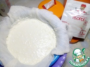 Марлю складываем в четыре слоя, накрываем дуршлаг, который ставим на миску или кастрюлю и выливаем сгусток. Даем сыворотке полностью стечь в подвешенном состоянии.
