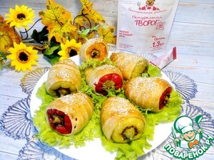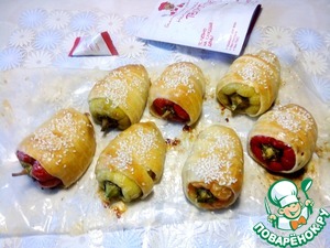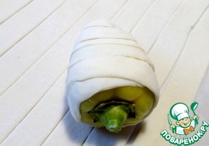 Слоеное тесто раскатать в длину толщиной 2-3мм, нарезать полосы в 2-2,5см шириной и начинаем обматывать перцы с широкой стороны внахлест, спиралькой. В конце тесто хорошо защипать. Если полоски не хватает, добавлять следующую. Во время обматывания, слегка смазывать в некоторых местах тесто взбитым яйцом, чтоб оно хорошо прилипало.