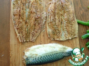 • Разделать скумбрию на филе, убрать все косточки. Ароматизировать филе приправой и посолить. Оставить мариноваться на 30 минут.