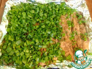 • Духовку разогреть до 180 градусов. Зеленый лук порезать колечками. Противень застелить фольгой, смазать растительным маслом. Переложить филе скумбрии на противень и закрыть слоем зеленого лука.