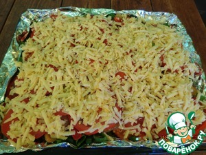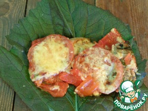 • Сыр нашинковать на крупной терке и разложить поверх помидор - золотистая корочка будет обеспечена.