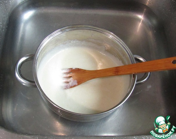 Охладить до 40 градусов. Я ставлю в бОльшую миску с холодной водой и постоянно мешаю, чтоб не появилась пенка. Градусника нет, поэтому остужаю до теплого состояния.