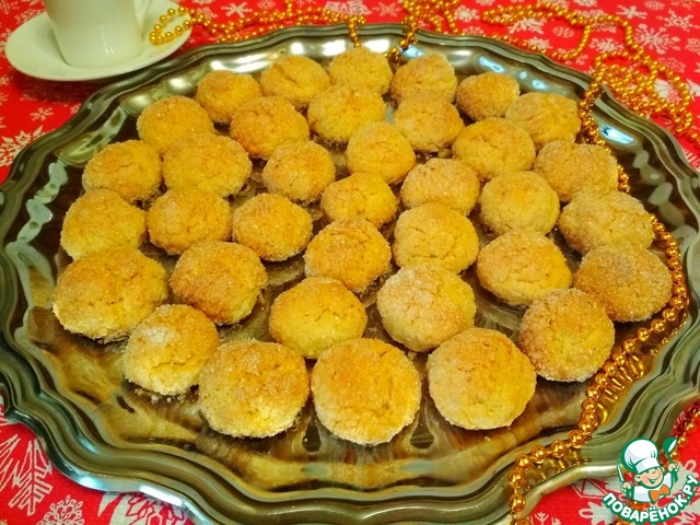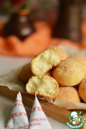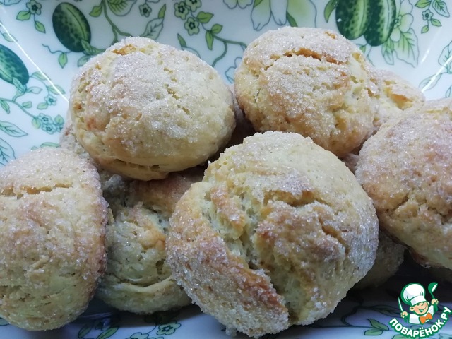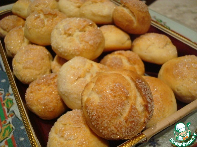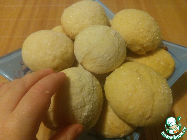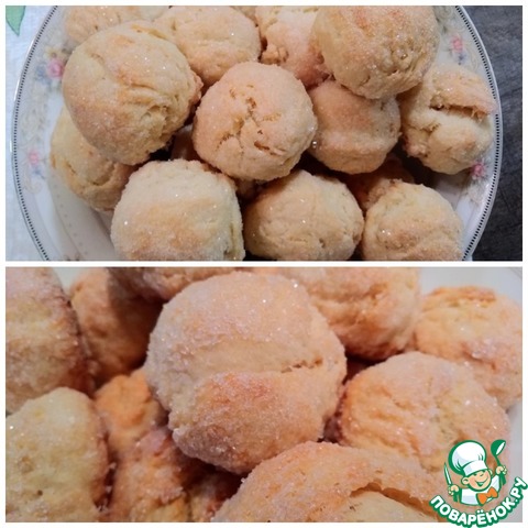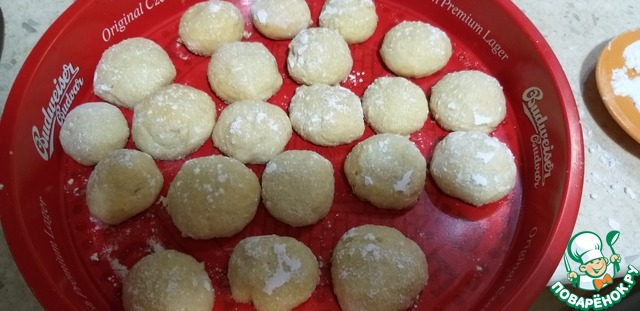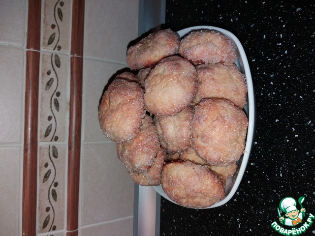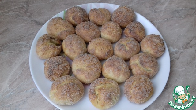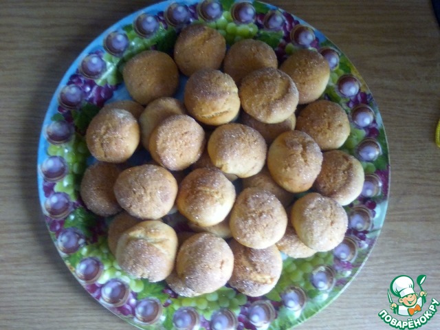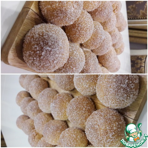Замесить мягкое эластичное тесто. Сформировать шарики размером с грецкий орех, обмакнуть в сахар и выложить на противень, застеленный пергаментом.
