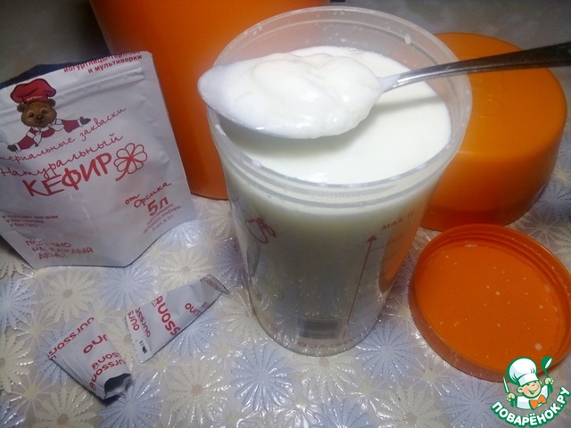 Чтобы приготовить нежный кефир, нам понадобится йогуртница - термос и закваска кефир Orsik. Ну и конечно же нужно молоко, можно взять домашнее, можно и магазинное 3,2%. В стакан для приготовления кефира, налить теплое молоко, всыпать закваску, хорошо перемешать. Закрутить крышку и поставить в термос -йогуртницу, налить до отметки кипяток. Закрываем термос крышкой и оставляем для сквашивания на 6-10 часов.