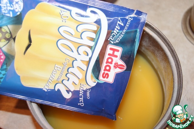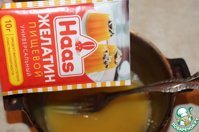 • 100мл апельсинового сока нагреть до 70 градусов, всыпать туда 1 пакетик пищевого универсального желатина ТМ Haas и помешивая растворить. Желатин растворился очень быстро.
