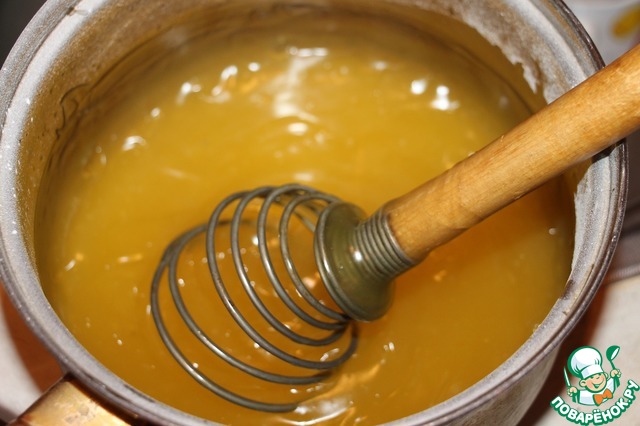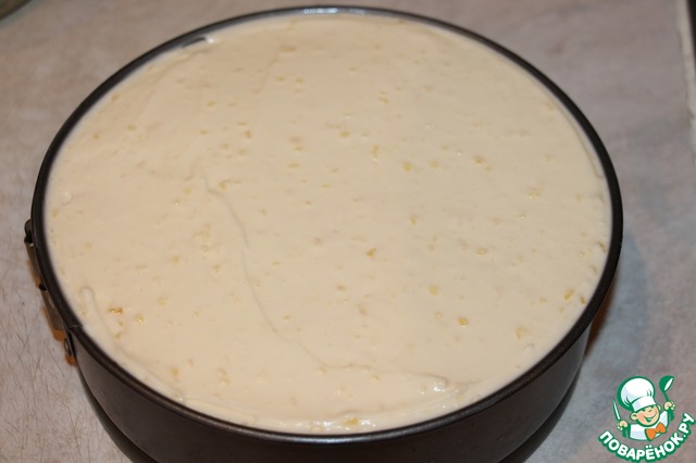 • Вылить массу поверх коржа и убрать на 4 часа в холодильник для стабилизации. Сверху можно украсить желтой глазурью и дольками мандарина.