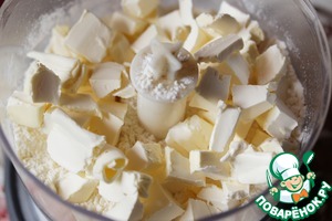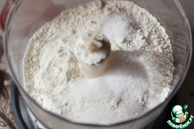 В чаше комбайна смешать муку, соль и сахар. -