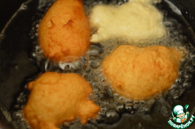 В глубокой посуде разогреть масло. Чайной ложкой набирать тесто и отправлять во фритюр. Тесто сильно увеличивается в объеме. Жарить пончики на среднем огне, чтоб хорошо прожарилась середина.