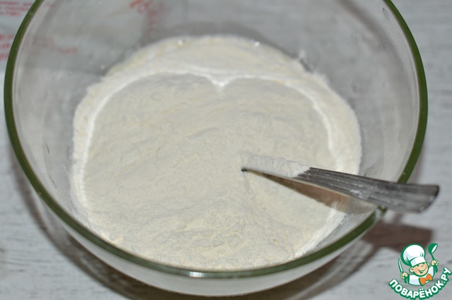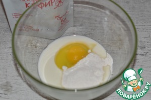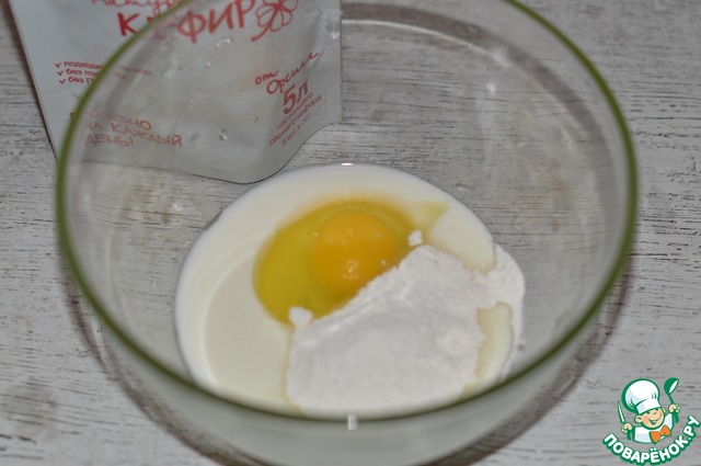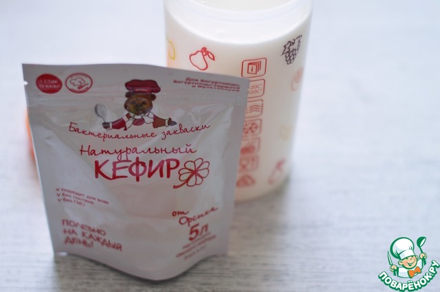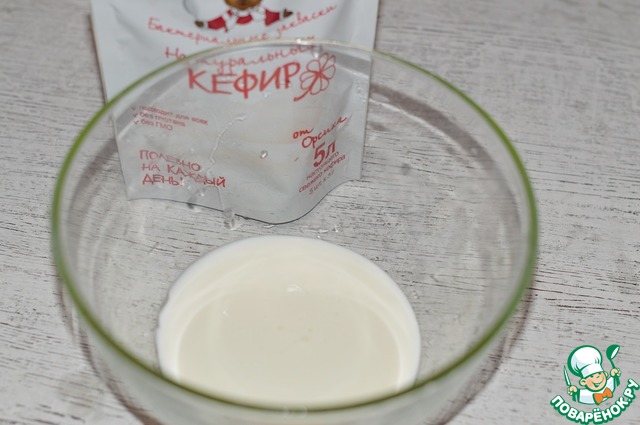 Для печенья нам нужно приготовить заранее кефир. Емкость для приготовления кефира простерилизовать. Влить в нее пастеризованное молоко комнатной температуры. (у меня молоко 2,5% жирности) В молоко всыпать закваску для приготовления кефира, тщательно перемешать чистой сухой ложкой до полного растворения закваски.