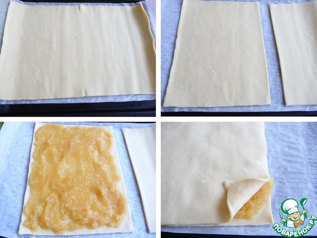 На одну часть выложить яблочную начинку, равномерно распределить по тесту, накрыть второй половиной, слегка прижать тесто.