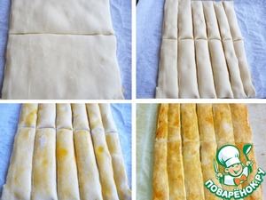 Ножом для пиццы разрезать пласт на две части и каждую еще на 6 полосок.
