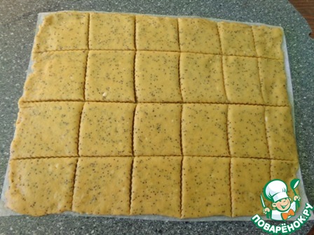 На бумаге для выпечки (у меня размером 24,5 х 31 см.) раскатать тесто в тонкий пласт, вырезать выемкой заготовки крекера или разрезать тесто на четырехугольники (треугольники).