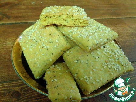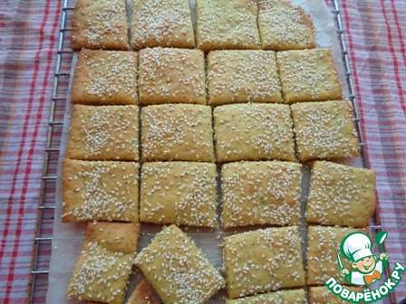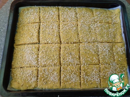 Переставить противень в духовку и выпекать 12 - 15 минут при температуре 190 градусов. Готовый крекер снять с противня и переложить на решетку.