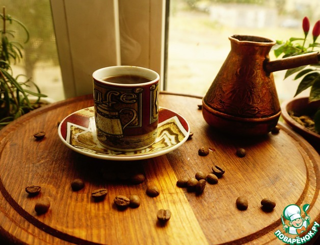 А в это время готовим кофе. Для тех, кто не умеет варить натуральный кофе в джезве, расскажу как это делается. В джезву наливаем кипяток и выливаем его в чашку, из которой мы будем пить кофе, она должна быть теплой. Затем в теплую джезву засыпаем кофе из расчета 2 ч. л. на 200 мл воды. Можно немного перемешать. Для более насыщенного вкуса, добавляем несколько крупинок соли. Соль будет играть роль усилителя вкуса. Ставим джезву на медленный огонь и ждем, когда кофе поднимется. Снимаем с огня, ждем, пока пена опуститься. Снова возвращаем на огонь. Ждем поднятие кофе. Снова снимаем и снова возвращаем. После третьего поднятия пены, снимаем с огня и накрываем джезву блюдцем. Оставляем на 2-3 минуты. Потом вливаем в джезву 1 ч. л. ледяной воды. Это нужно для того, чтобы кофеинки опустились на дно. После этого в теплую чашку через сито наливаем кофе. Из полученных 200 мл. кофе 100 выпиваем, а 100 оставляем на конфитюр.
