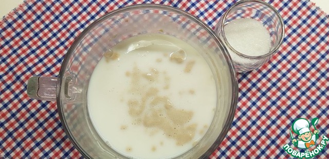 Добавляем сахар и дрожжи. Размешиваем. Оставляем на 10 минут, чтобы дрожжи начали работать и образовали шапочку.