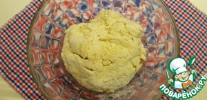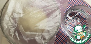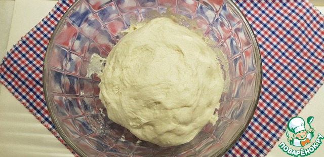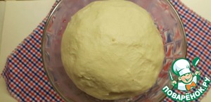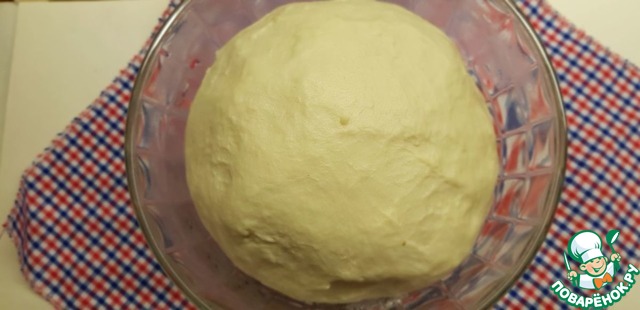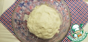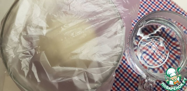 Накрываем тесто пищевой плёнкой и ставим в тёплое место на 35-40 минут. Отлично подойдёт выключенная микроволновка, в которую нужно поставить стакан горячей воды.