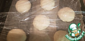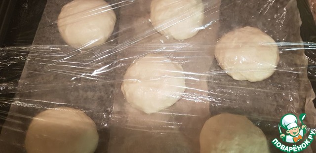 Смазываем пергаментную бумагу подсолнечным маслом. Снова формируем булочки, подворачивая их внутрь, чтобы получились плотные упругие колобки. Выкладываем на противень. Немного прижимаем их сверху рукою, для придания более плоской формы. Оставляем на 40 минут, накрыв пищевой плёнкой. Следите за тем, чтобы плёнка не соприкасалась с тестом.