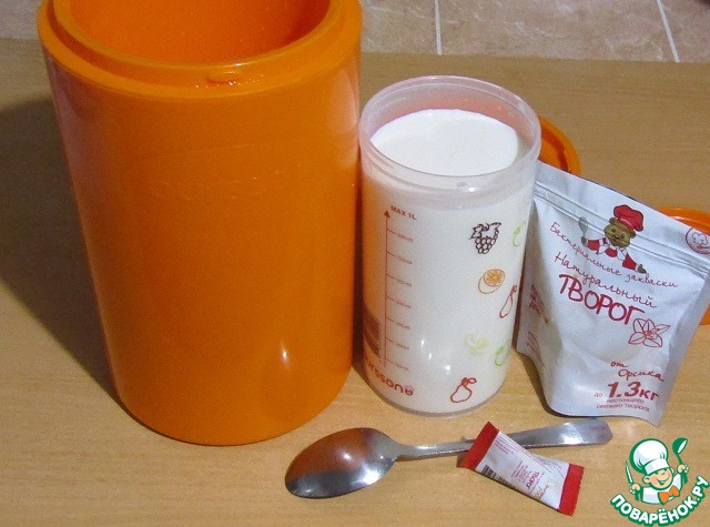 Литр молока комнатной температуры нальем в стерилизованный стакан, добавим один пакет закваски и размешаем до полного его растворения чистой, сухой ложкой, минуты 2-3. Плотно закроем крышкой.