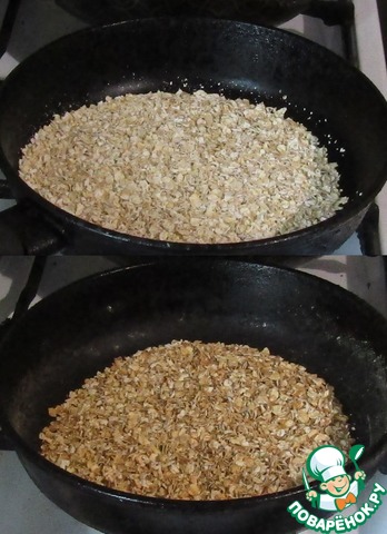 Овсянку поджарим на сухой сковороде до потемнения и в кофемолке перемелем. Можно взять готовое толокно.