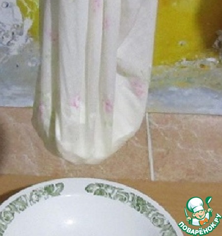 Готовую массу разрезаем чистым, сухим ножом на квадраты и поставим на водяную баню. Когда масса начнет отделяться от стенок и сворачиваться, процедим через плотную ткань.