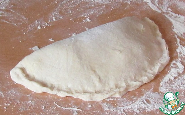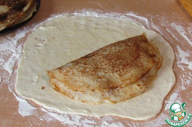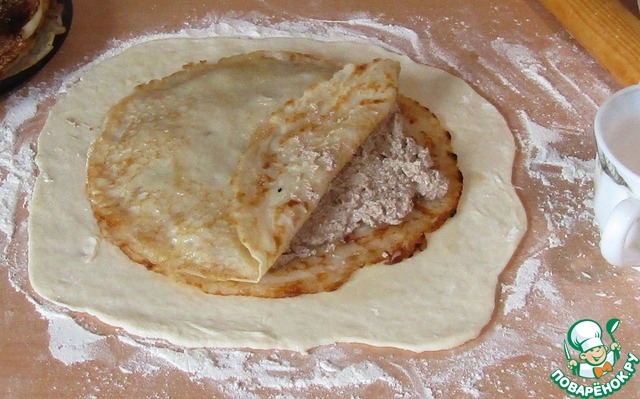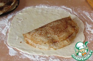 Раскатываем нашу лепешку толщиной 2 мм, смажем растопленным сливочным маслом. На лепешку кладем блин, смажем и его сливочным маслом, на него начинку, сверху второй блин и смазываем маслом.