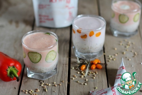 Начинаем собирать наш смузи. На дно выложим йогурт с гречневой крупой. Кстати при желании его можно сбить с овощной или ягодной частью.