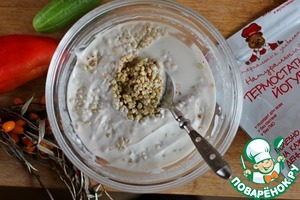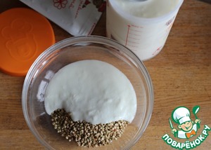 Теперь соединим два очень полезных продукта. С вечера в зёленую гречневую крупу добавим йогурт. Перемешаем и поставим в холодильник.