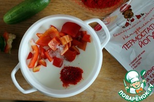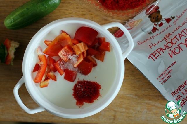 Теперь помоем и почистим перец, измельчим его с йогуртом, добавив соль и паприку.