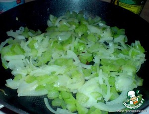 На растительном масле обжариваем нарезанные лук и сельдерей до полупрозрачности лука. Это займет минут 5-7.
