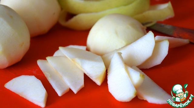 Подготовим яблоки. Их нужно очистить от кожуры и вынуть серединки. Яблоки нарезаем дольками.